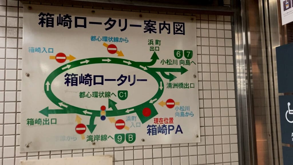 6.箱崎出口の看板に沿って箱崎JCT下層の箱崎パーキングエリアへ